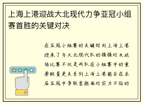 上海上港迎战大北现代力争亚冠小组赛首胜的关键对决
